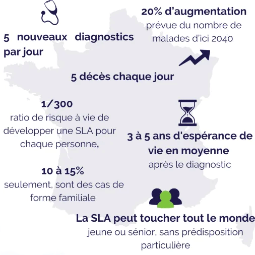 - En France, environ 8 000 personnes vivent avec une SLA.